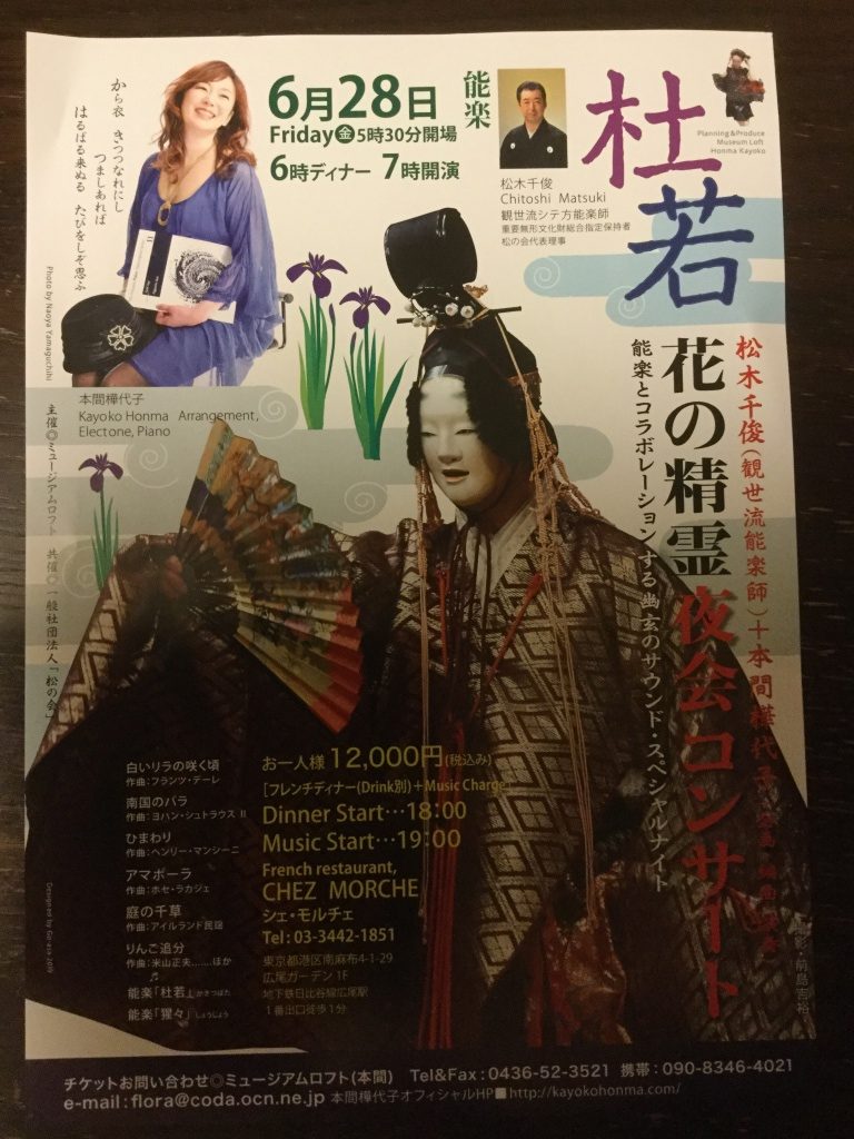夜会コンサート 2019-06-29 最終更新日時 : 2019-06-29 松木千俊 昨日は昨年に引き続き本間樺代子さんのコンサートに出演させていただきました。 お天気が心配でしたが、良いお天気で素敵なコンサートになりました。 杜若と猩々の一部を崇俊の地謡で舞いました。 間近に舞をご覧いただき、皆様とても喜んで下さいました。