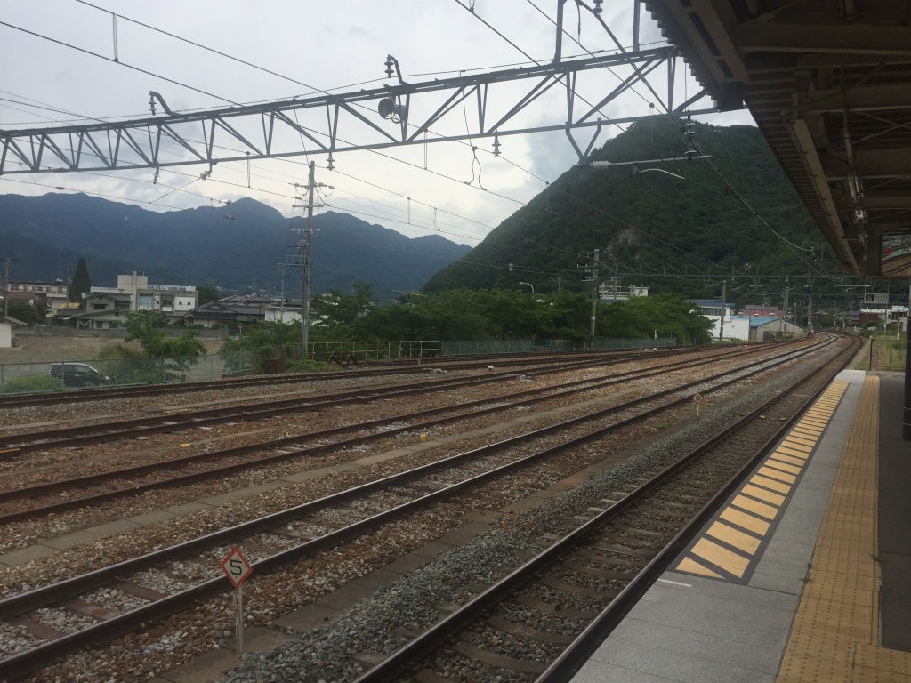 テクノ坂城駅と坂城駅です。山に囲まれ、千曲川が流れる素敵なところです。