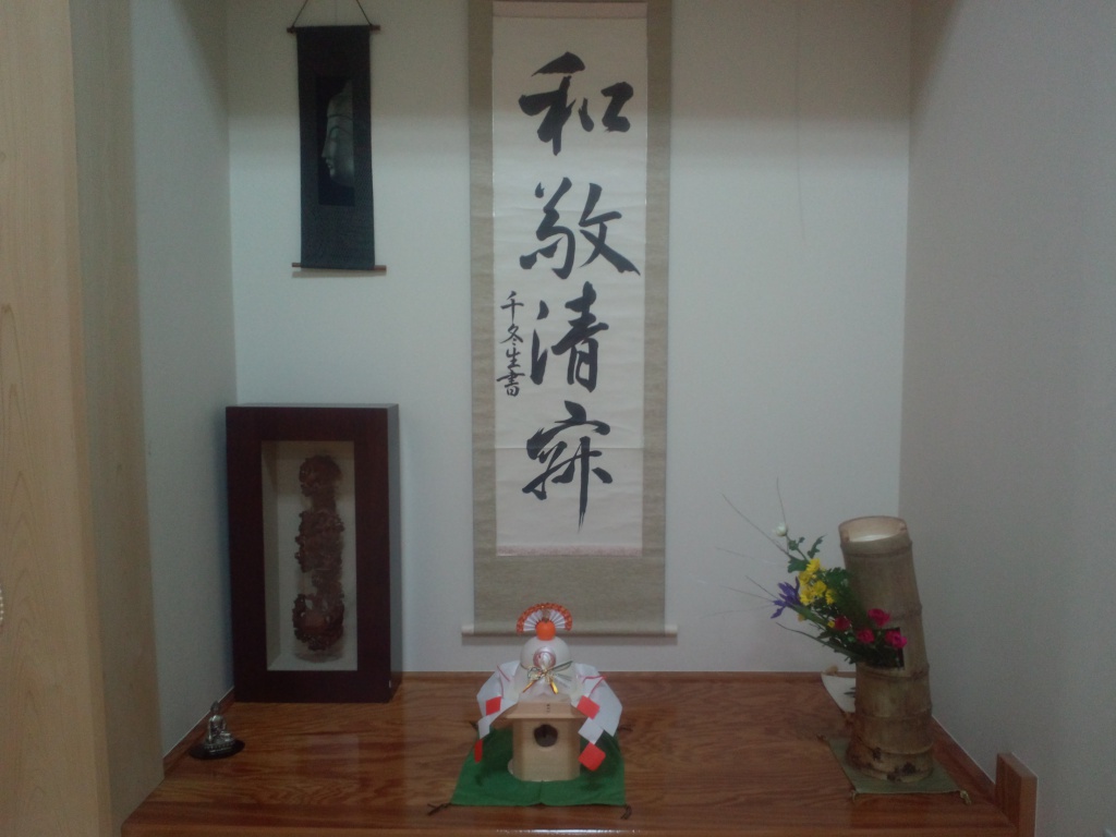 床の間に鏡餅と、去年佐倉で頂いた竹の花入れに花を生けました。(自己流です)掛け軸はいつもの父の書です。今年はこの右に私の書き初めをかけるつもりです。(右にスペースがありますでしょ)父には追いつきませんが、51年目の人生はじめの意気込みを書に表したいと思っています。恥ずかしながら、書きましたらお知らせさせて頂きます。